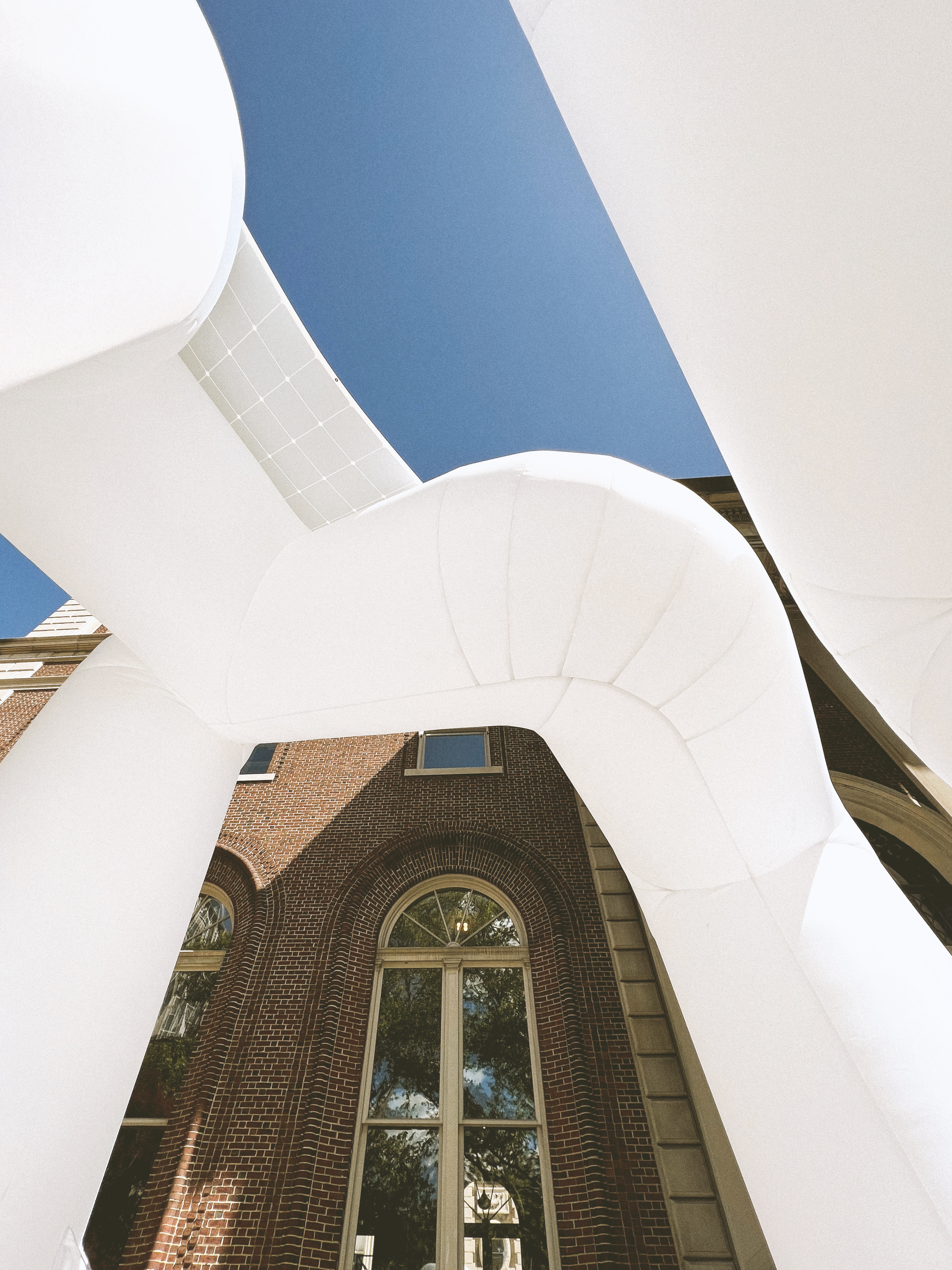 Designed and constructed by students in the “Outside-In Project” seminar during the Spring 2023 semester, this inflatable installation, titled GSAPP x WORM invites all kinds of interaction between user and pavillion. Visitors can walk through, play with, jump on, sit on, and lie down on the inflatable. The concept of a continuous line was employed to create simplicity in form for an ease of assembly and reduction in material cost and construction time frame. The pitched upper arms of WORM were designed to optimize incident sunlight to increase the efficiency of two mounted photovoltaic panels.